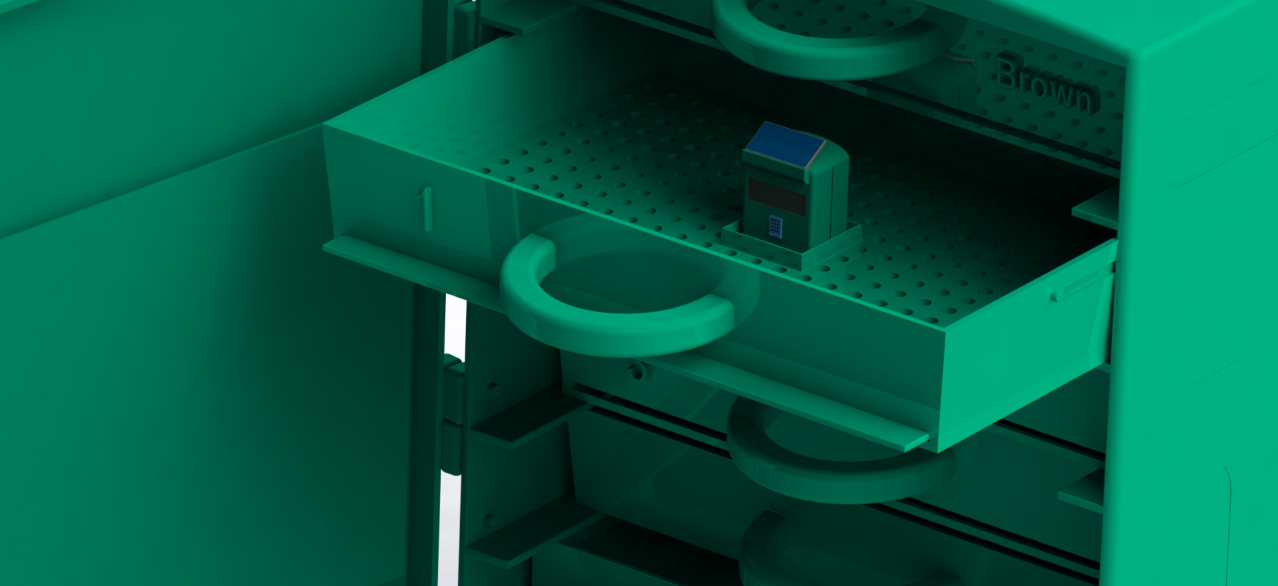 A sieve tray unit that allows the garden waste to naturally filter through slowly as it decays, with each tray having smaller sieve holes down to the bottom. Trays numbered 1-3 have an RFID tag embedded within the centre where the Compo-Sense probe sits and detcts it.