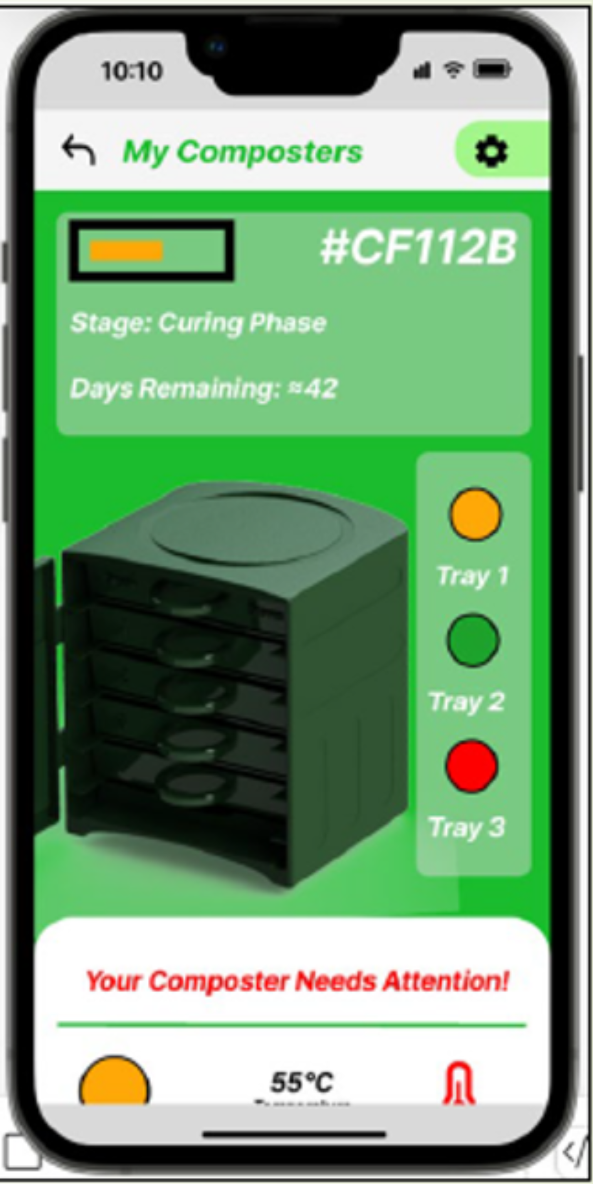 A corresponding connecting app that the Compo-Sense Probe syncs to, provding clear information on the conditions of each tray, provides alerts, as well as guides and tips to help users.